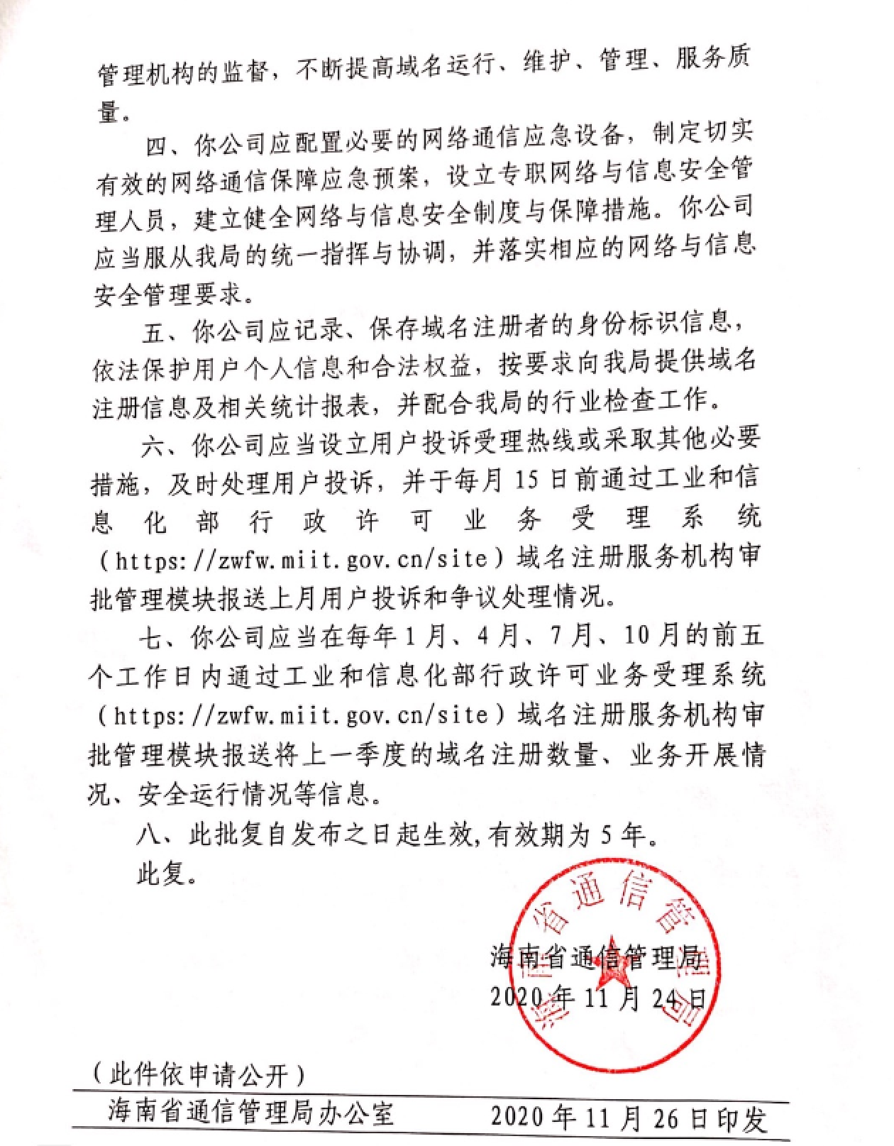 海口智慧康已经于2021年取得海口省通信管理局域名注册服务机构批文: